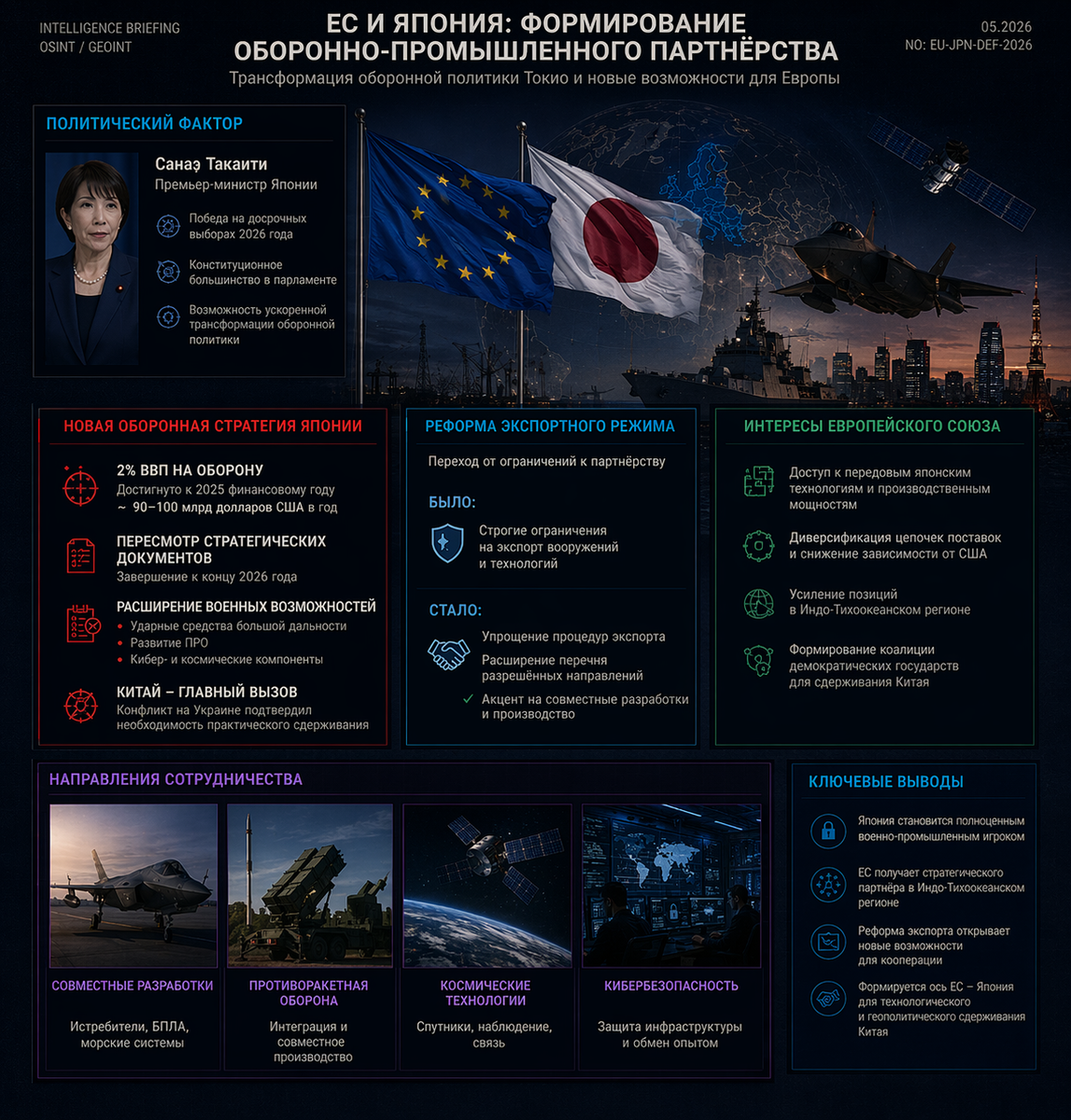 Практическая база для такого взаимодействия уже заложена соглашением о партнёрстве в области безопасности и обороны между ЕС и Японией, подписанным в ноябре 2024 года. Документ охватывает морскую безопасность, киберзащиту, противодействие гибридным угрозам, космическую сферу и обмен в оборонной промышленности. Однако до 2026 года он носил преимущественно рамочный характер. Текущие политические изменения в Токио создают условия для перехода к операционному уровню сотрудничества, включая совместные разработки в области беспилотных систем, ПРО и морского наблюдения.