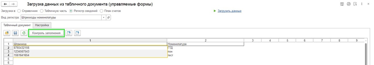 1. Проверьте права пользователя 📍 НСИ и администрирование - Настройка пользователей и прав - Пользователи - «Права доступа» ✔ Должно быть право «Открытие внешних отчетов и обработок» ✔ Если нет — добавьте через «Включить в группу» 2. Откройте обработку 📍 Меню - Файл - Открыть файл - выберите нужную обработку 3. Настройте параметры загрузки · Загрузка в - «Регистр сведений» · Вид регистра - «Штрихкоды номенклатуры» 4. Настройте колонки На вкладке «Настройка» установите: · ✅ Штрихкод · ✅ Номенклатура · ✅ Характеристика (если используется) 5. Заполните табличную часть ✔ Нажмите «Обновить» на вкладке «Табличный документ» ✔ Скопируйте из Excel по колонкам - через «Специальную вставку» вставьте: · Номенклатуру · Штрихкод 6. Загрузите данные ✔ «Контроль заполнения» → проверьте ошибки ✔ Нажмите «Загрузить данные» Подробнее в нашей инструкции: https://clck.ru/3T5P55