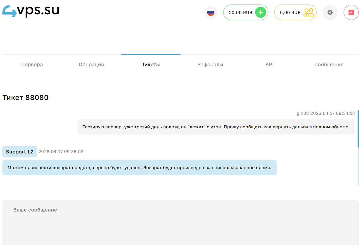 Попросил вернуть деньги полностью, с учётом того что из четырёх дней сервер нормально работал от силы один. Отказали. Предложили вернуть только за «неиспользованное время» — то есть за те часы когда я формально ещё не оплатил.