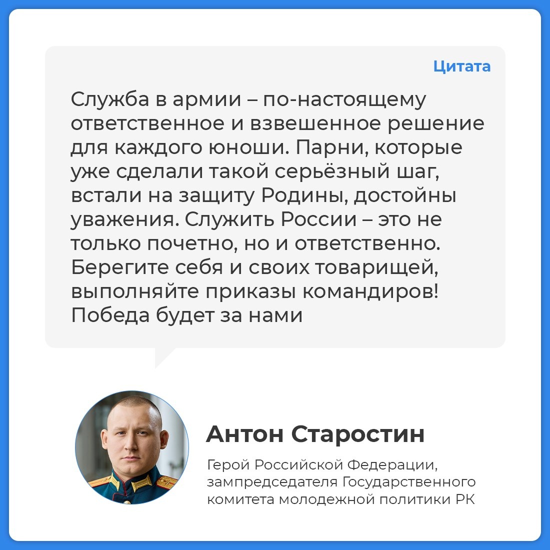 Антон Старостин сейчас является заместителем председателя Государственного комитета молодежной политики Республики Крым. Он окончил школу в Калининграде, затем отучился в колледже на автомеханика. После срочной службы в армии, поступил в Казанское высшее танковое командное училище. Служил в Перевальном. За выполнение задач в зоне спецоперации удостоен звания Героя Российской Федерации. Антон Старостин знает, что такое боевое братство, гордится своими подчиненными. Он считает, что служить России – это значит защищать и любить свое Отечество, быть патриотом и трудиться во благо своей страны. Присоединяйся к СВОим! Больше информации о службе по контракту в ВС РФ в можно получить по номеру 117.