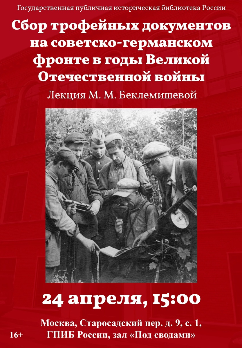 СБОР ТРОФЕЙНЫХ ДОКУМЕНТОВ НА СОВЕТСКО-ГЕРМАНСКОМ ФРОНТЕ В ГОДЫ ВЕЛИКОЙ ОТЕЧЕСТВЕННОЙ ВОЙНЫ в пятницу, 24 апреля 2026 г., в 15.00 ч. в Государственной публичной исторической библиотеке России в зале «Под сводами» в рамках работы Военно-исторического клуба «О доблестях, о подвигах, о славе» состоится лекция Марии Михайловны Беклемишевой, кандидата исторических наук, научного сотрудника, ученого секретаря Центра по изучению истории Великой Отечественной войны Института Российской истории Российской Академии Наук. М.М. Беклемишева расскажет об интересном и малоизвестном сюжете истории Великой Отечественной войны – об организации сбора, систематизации и передачи в советские архивы документов, которые оказались в руках у Красной армии в качестве трофея после сражений с немцами или же при отступлении противника. Во время Великой Отечественной сбором документальных данных занимались несколько государственных органов – в первую очередь, органы разведки, Главное политическое управление РККА, У