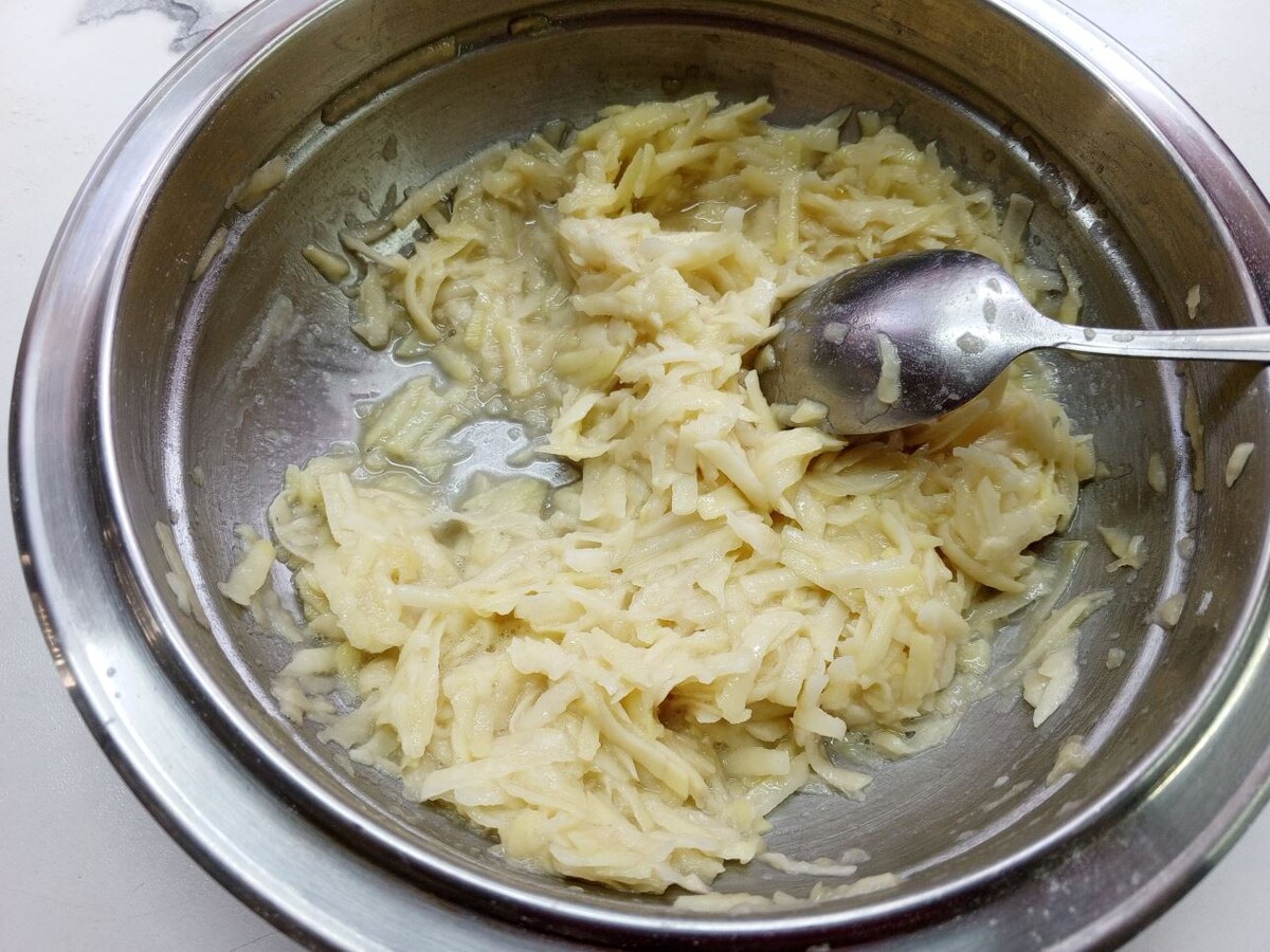 Хочется жареной картошки, но жарить не хочется? Есть альтернатива - картофельные драники. Готовятся легко да и поджаристая корочка обеспечена каждому! И по вкусу совсем не отличаются! Честно признаюсь, готовила впервые. Сегодня в запасе было только 3 картофелины среднего размера, на троих - маловато. А в драниках-то 3 картофелины кажутся большими и вполне хватает на всех троих. А самое главное, это простота приготовления, миска и ложка. Картофель натереть на крупной терке, луковицу (размер ее не имеет значения) - на мелкой. Добавить сырое яйцо, посолить и поперчить. Всыпать муку, перемешать. Все! Картофельная масса готова к выпечке. Это у меня для второго захода осталась картофельная масса. В ней жидкости мало. Если будет много жидкости, лучше ее слить аккуратно. Кто-то решит, что лучше добавить муки... Нет, лучше слить. Нагреть сковороду, влить масло растительное, нагреть его и ложкой выложить картофельную массу, разровнять. Огонь убавить на или почти на минимум (жарила на средней