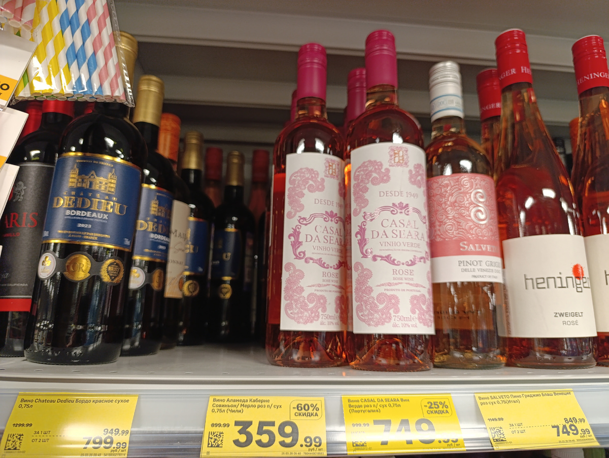 Например, вот вам полка с ценником на розовое вино «Аламеда» со скидкой аж 60%, смешная цена в 359 рублей: