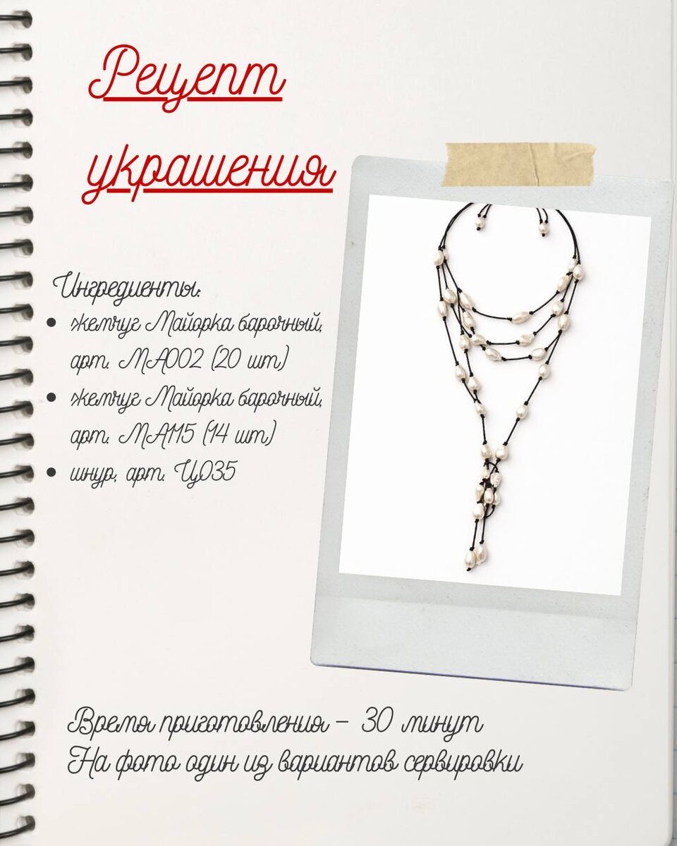 Продолжаем нашу рубрику и сегодня собираем колье с нежным, жемчужным настроением ✨ Сочетание майорки разных размеров делает украшение объёмным и живым. Оно мягко переливается, выглядит аккуратно и добавляет образу той самой спокойной элегантности. Рецепт украшения Основные ингредиенты — Жемчуг Майорка барочный, арт. МА002 (20 шт) — Жемчуг Майорка барочный, арт. МА115 (14 шт) — Шнур, арт. Ц035 Приготовление Отмеряем 2 метра шнура и с одной стороны завязываем узелок так, чтобы он удерживал бусины и не проходил в отверстие. Нанизываем бусины майорки, поочерёдно закрепляя каждую с помощью нескольких узелков с обеих сторон. Чередуем крупные жемчужины с мелкими, создавая ритм и объём. Делаем узелки для регулируемого замочка. Украшаем концы украшения мелкими жемчужинами, завязываем крепкие узелки и аккуратно опаливаем концы шнура. Готово ✨ Получается колье с мягким сиянием и деликатным, благородным настроением. Мы на связи: 📲 в Макс 📱 в запретграме 📱 в ВК