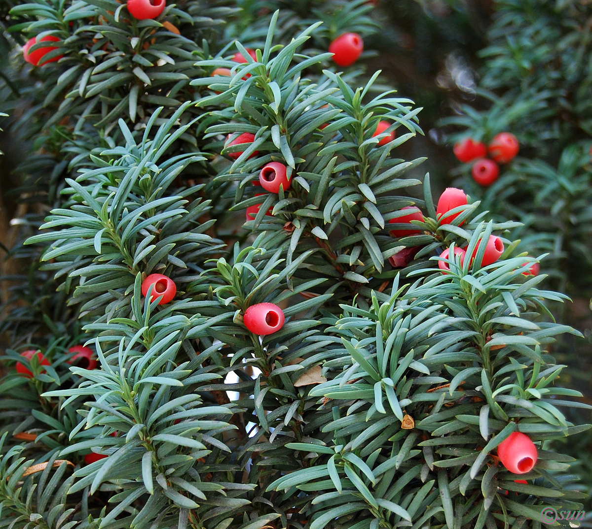 Тис ягодный. Хвоя и семена содержат таксин — сильнейший яд, вызывающий остановку дыхания. Яркая мясистая кровелька ягоды безвредна, но проглатывание семени внутри неё опасно. Тис особенно токсичен для крупного рогатого скота и лошадей.