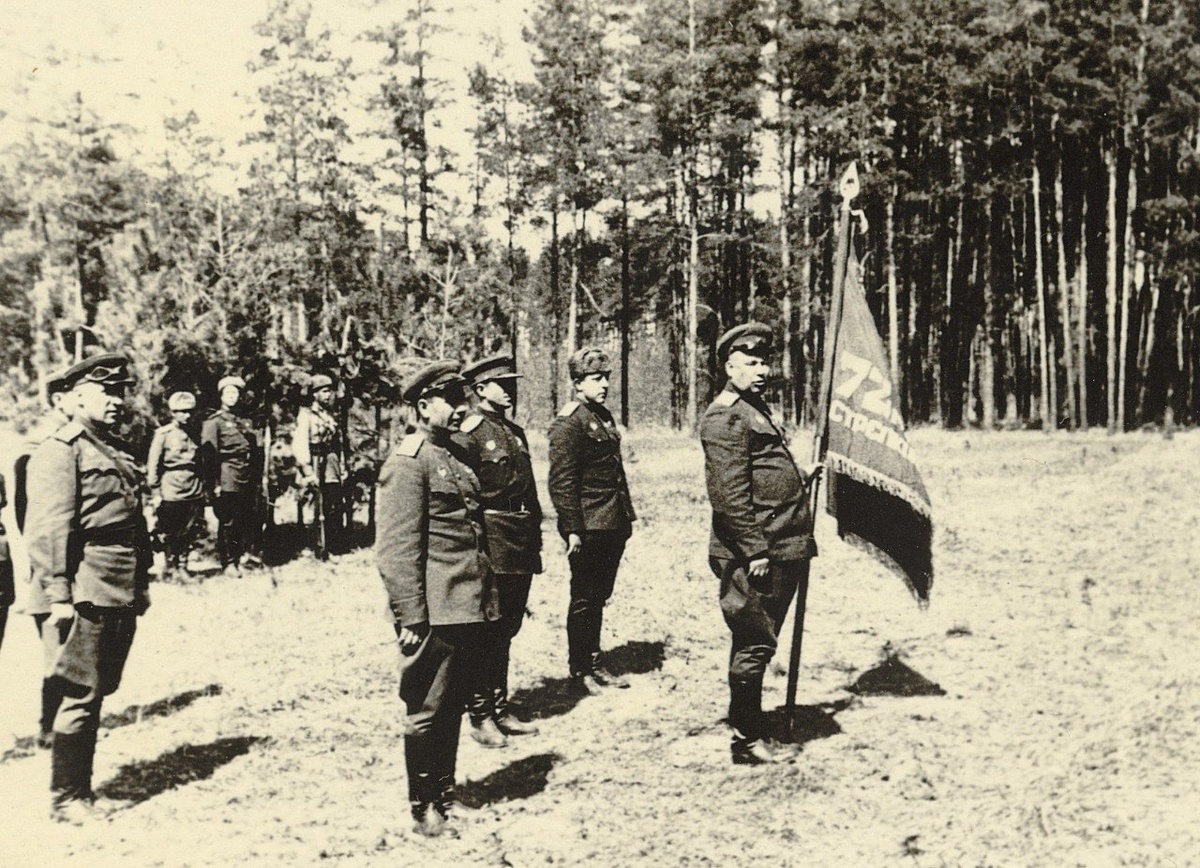 Командующий 7-й гвардейской армией (64-я) Шумилов М.С. вручает гвардейское знамя 72-й гвардейской стрелковой дивизии (29-я сд), по центру в шапке ушанке командир 72-й гв сд А.И. Лосев. Весна 1943г.