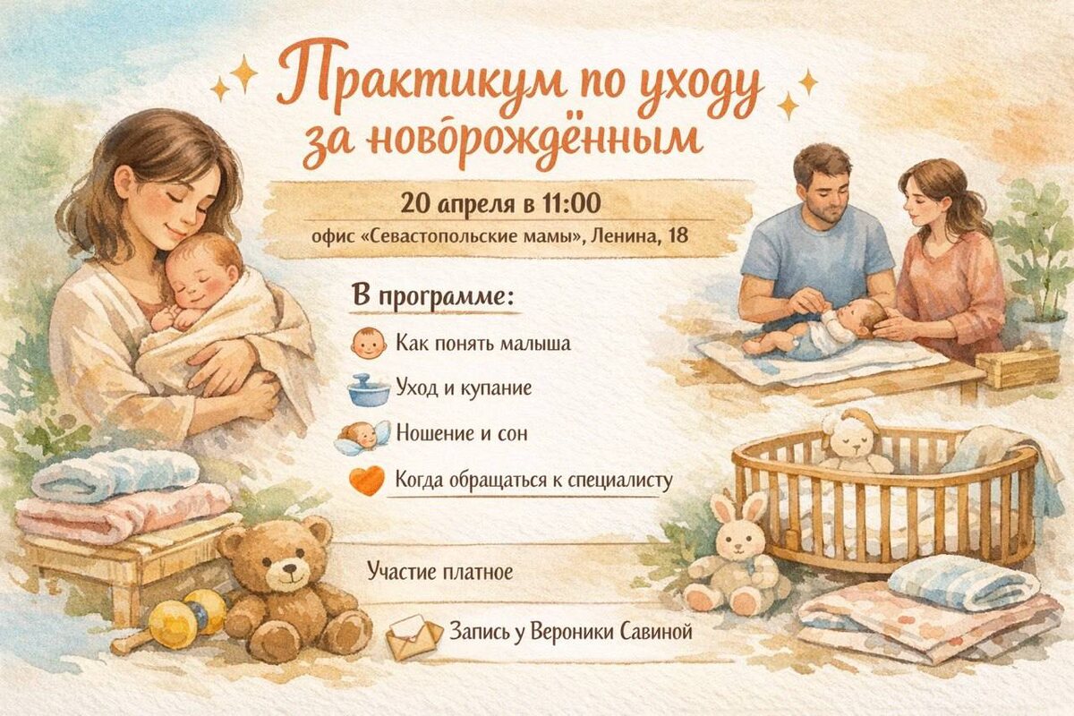 20 апреля в 11:00 приглашаю будущих родителей и семьи с малышами на практическую встречу, где будем разбирать самые важные вопросы ухода за новорождённым — спокойно, понятно и без страшилок из интернета. Что будем обсуждать: 👶 как понять потребности малыша 🛁 уход за кожей, купание, гигиена 🤲 как держать, носить, выкладывать, успокаивать 😴 особенности сна новорождённого 💛 что нормально, а что повод обратиться за помощью Это не просто лекция, а практикум — можно будет посмотреть, попробовать, задать вопросы и уйти с ощущением: «я справлюсь». 📅 20 апреля ⏰ 11:00 📍 офис «Севастопольские мамы» Ленина, 18 💳 Участие платное 📩 Запись у Вероники Савиной в личные сообщения 💦Тут интересное про мам и младенцев 💦 ГИД для МАМ по ГВ 🤱 АНО "Мама" 📱 Канал в Вконтакте 🔵 Канал в Мах
