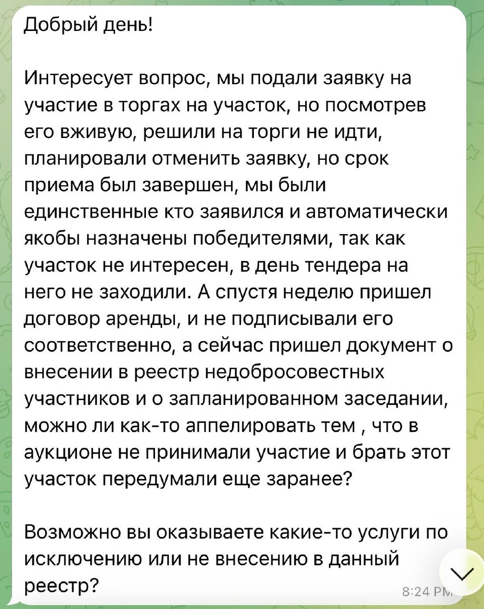 Коротко: 👉 после подачи заявки «передумать» уже нельзя без последствий ⚠️ Реальный случай Клиент подал заявку на участок. Потом: выехал на место понял, что участок не подходит решил просто не участвовать 👉 думал, что на этом всё 💥 Что произошло дальше заявка уже подана он был единственным участником 👉 автоматически признан победителем Дальше: пришёл договор аренды он его не подписал 👉 итог: потерян задаток внесение в реестр недобросовестных участников запрет участвовать в торгах до 2 лет ⚖️ Важно понимать Если вы: подали заявку и стали победителем 👉 вы обязаны подписать договор Даже если: не пришли на торги передумали участок «не понравился» 👉 это не основание для отказа 🚫 Главная ошибка Проверку сделали после подачи заявки А нужно: 👉 до участия в торгах 📌 Что обязательно проверить заранее ГПЗУ (есть ли пятно застройки) ВРИ ограничения (ЗОУИТ) рельеф (овраг, болото) доступ к участку коммуникации ❗ Вывод Торги — это обязательство. 👉 подал заявку = го