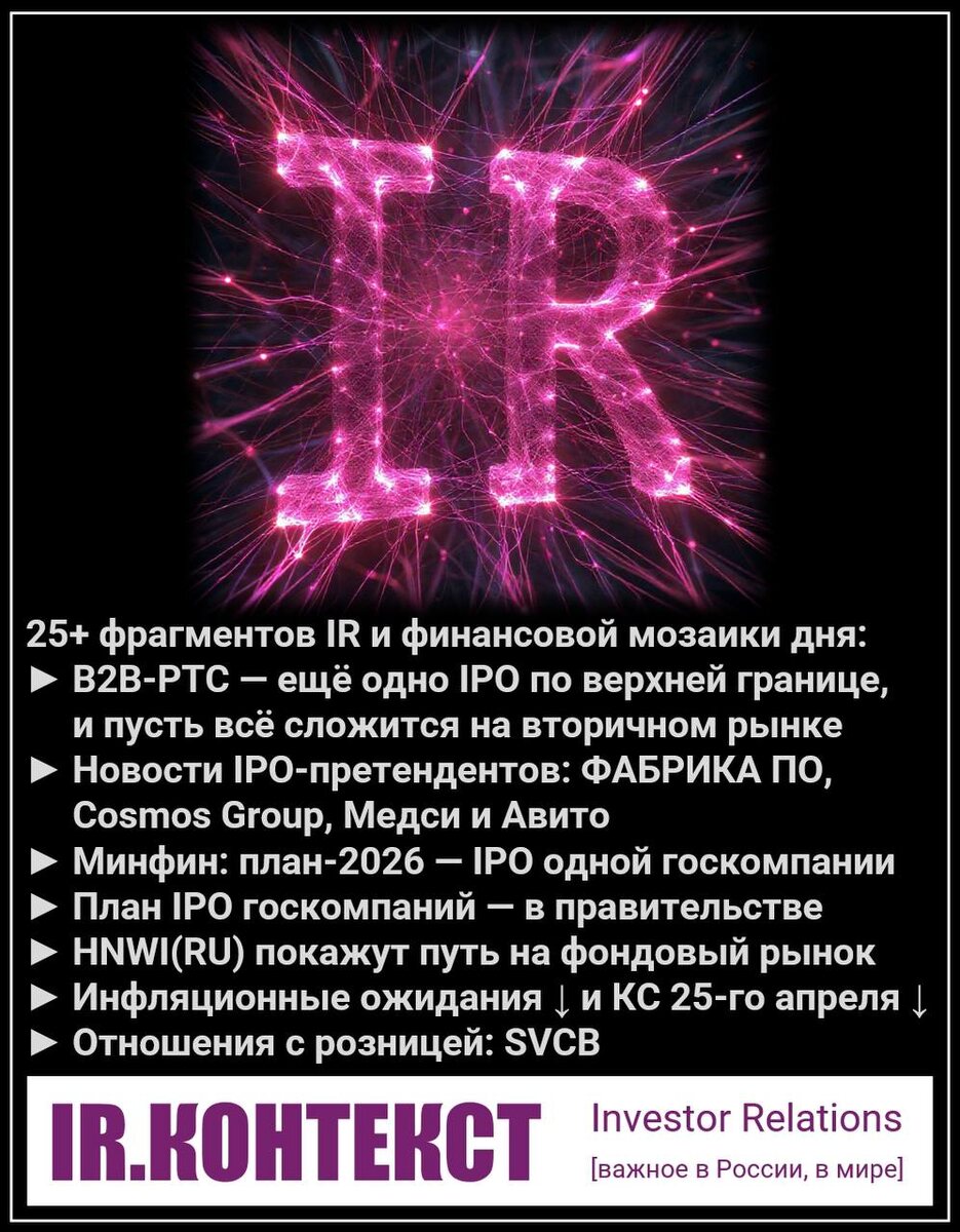 17.04.2026 ► B2B-РТС [BTBR] — книга заявок на IPO переподписана по верхней границе ценового диапазона — ₽118. Заявки активно поступают от институциональных и розничных инвесторов. IPO станет первым в России в 2026 году, а старт торгов запланирован на 17 апреля. (РБК) Новости IPO-претендентов ► Минфин РФ сократил план по выводу госкомпаний на биржу на 2026 год. ► "Московская биржа" 16 апреля запустила сервис "Скоринг", который позволит брокерам при регистрации нового клиента получать информацию о его опыте и активности на бирже, а также наличии или потенциале присвоения статуса квалифицированного инвестора. Стимулирование компаний к выходу на фондовый рынок ► Э. Набиуллина, председатель ЦБ РФ: нужно решать фундаментальные проблемы, почему люди с большими деньгами не инвестируют в фондовый рынок РФ. (Смартлаб) Читать далее Формирование условий для следующей волны IPO (продолжение снижения КС в апреле 2026г?) ► 12,9% — инфляционные ожидания населения РФ в апреле снизились до уровня ма