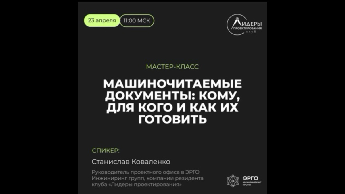 В проектных организациях требования к машиночитаемым документам становятся жестче и шире. У многих до сих пор нет понимания, кто должен готовить «схемы документов» и как перестать делать двойную работу. 23 апреля в 11:00 клуб «Лидеры проектирования» проведет открытый онлайн-мастер-класс «Машиночитаемые документы: кому, для кого и как их готовить?» Спикер: Станислав Коваленко, руководитель проектного офиса компании «Эрго Инжиниринг групп». Три высших образования, два из них связаны с проектированием и строительством. Более 15 лет в отрасли, из них 12 лет — на руководящих позициях. Сейчас его фокус — адаптация бизнес-процессов под новые нормативные и законодательные требования. На мастер-классе разберем: — кому на самом деле нужны эти данные и как извлечь из них пользу для своей работы — схема документа, документ и файл: и как они интегрируются в проект — обзор инструментов для подготовки документов на примере пояснительной записки — Чего ждать от рынка в ближайшем будущем: темпы внедре
