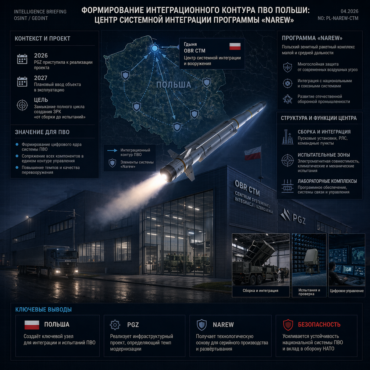 В 2026 году Польская группа вооружений (Polska Grupa Zbrojeniowa, PGZ) приступила к реализации ключевого инфраструктурного проекта в рамках модернизации национальной системы противовоздушной обороны — созданию Центра системной интеграции и вооружения на базе OBR Centrum Techniki Morskiej (OBR CTM, г. Гдыня). Соответствующее соглашение было заключено в начале 2026 года; ввод объекта в эксплуатацию запланирован на 2027 год. Данные параметры подтверждаются официальными материалами PGZ и публикациями польских отраслевых изданий, освещающих ход программы Narew.