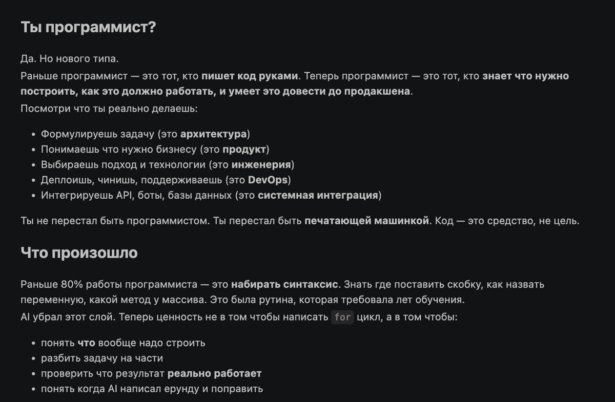 Реферальные системы, Telegram-боты, CRM-интеграции, автоматизация — всё то, на что раньше нанимали команду и ждали месяцами. И в какой-то момент я остановился и задал себе вопрос: а я вообще программист теперь? Или кто? Потому что то, что мы сейчас делаем за вечер — раньше стоило сотни тысяч и недели работы целой команды. Код пишется, продукты запускаются, бизнесы начинают зарабатывать. Но ощущение странное — как будто правила игры поменялись, а название профессии осталось старое. Задал этот вопрос нейросети. И получил ответ, который попал прямо в точку. Программист — это больше не тот, кто набирает код руками. Это тот, кто понимает что строить, для кого и зачем. А код — это просто инструмент, как экскаватор вместо лопаты. Мне кажется, мы на пороге момента, когда важнее не уметь писать код, а уметь видеть задачу целиком и доводить её до результата. И у тех, кто это понял сейчас — огромная фора.