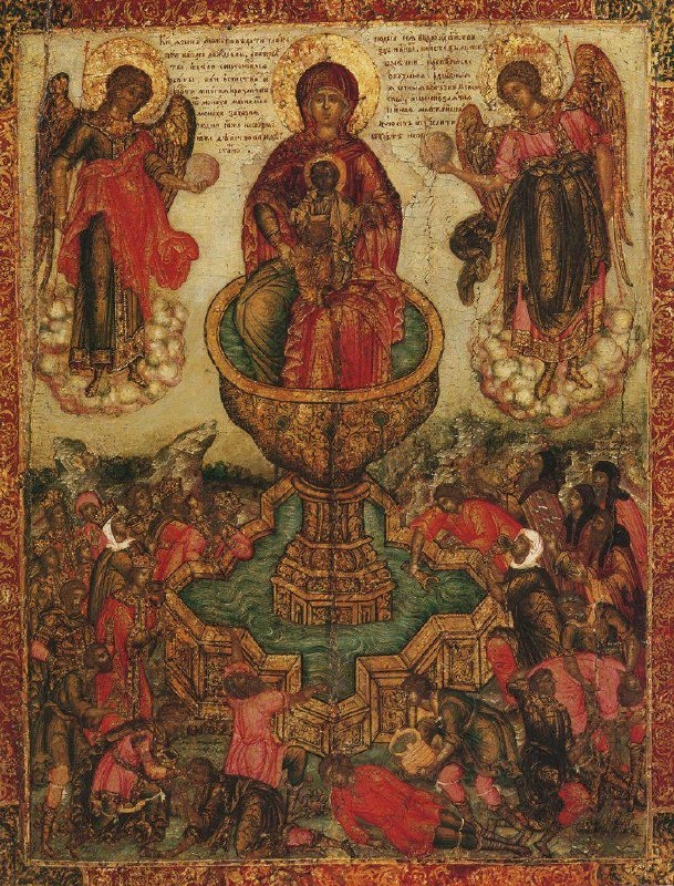 ❤ Среди множества икон Пресвятой Богородицы есть образ, который называется «Живоносный Источник». Его Церковь особо чтит в первую пятницу после Пасхи. 🟡В центре иконы — Пречистая Дева в полный рост, держащая на руках Младенца Христа. Она восседает внутри чаши, из которой струями изливается живая вода — символ благодати, дарующей исцеление и жизнь. Эта чаша напоминает о Евхаристии и одновременно — о колодце Иакова, из которого Сам Господь однажды просил воды у самарянки. Струи могут истекать как из самой чаши, так и из рук Богородицы, как будто Она Самим Своим присутствием питает мир. По сторонам чаши часто изображаются ангелы, радостно созерцающие излияние воды и раздающие ее страждущим людям. На некоторых иконах вокруг источника собираются больные, нищие, слепые, изможденные, протягивающие руки к живительным струям — образ человечества, жаждущего милости Божией. Тропарь 🌾 Почерпе́м, челове́цы,/ цельбы́ душа́м и те́лом моли́твою,/ Река́ бо всем предтече́т — Пречи́стая Цари́ца Бог