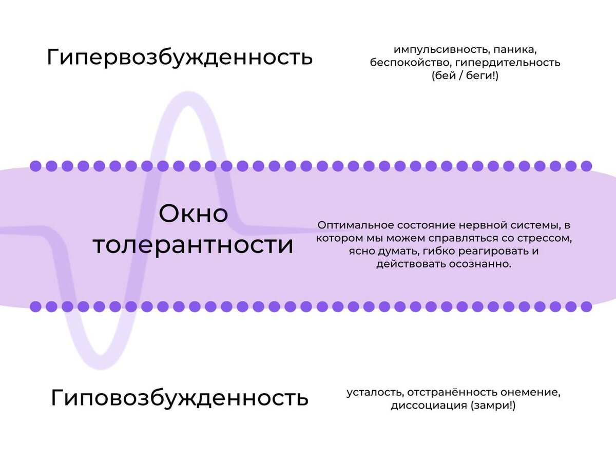 🆘 Представьте, что у вашей нервной системы есть «рабочая зона» - это то состояние, в котором вы спокойны, можете думать, принимать решения, общаться без скандалов, заботиться о себе и ребёнке. Это и есть окно толерантности, когда вы внутри этого окна - вы устойчивы. Можете пережить стресс, не сломавшись. Можете услышать неприятную новость, но не упасть в панику. Можете поспорить с мужем, но быстро прийти в себя. Но, когда вы выпадаете из окна - есть два варианта: 1. Гипервозбуждение (перегрев) Вы как будто натянутая струна. Всё раздражает, хочется кричать, бросать вещи, убегать. Сердце колотится, дыхание сбивается. Малейшая проблема кажется катастрофой. 2. Гиповозбуждение (заморозка) Вы как будто отключились. Внутри пустота, ничего не хочется, на всё наплевать, трудно встать с дивана, трудно думать, трудно даже плакать. Это состояние можно представить как будто «я в домике». ❗️Оба варианта про то, что нервная система перегружена и вышла из своей рабочей зоны. Мы живём в тревожное