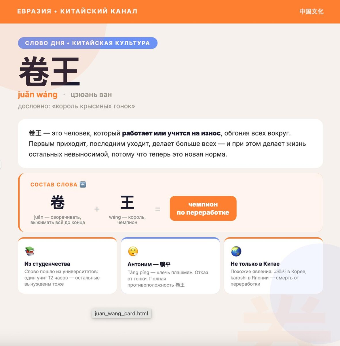 Представьте: в библиотеке один человек начинает учиться на час раньше всех. Через неделю все приходят на час раньше. Потом ещё на час. Никто не выигрывает — просто все устают сильнее. Вот это и есть 卷 — бесконечная конкуренция, где ты не можешь остановиться, потому что остановишься ты, а не другие. А 卷王 — чемпион этой гонки. Тот, кто работает или учится на износ и невольно поднимает планку для всех вокруг. У слова есть антоним — 躺平 (táng píng), «лечь плашмя». Это уже целое движение тех, кто сказал системе «нет» и отказался от гонки. Интересно, что похожие явления есть и в Корее (과로사), и в Японии (karoshi) — смерть от переработки. Азиатская культура производительности — это отдельная вселенная. А вы 卷王 или 躺平? 👇
