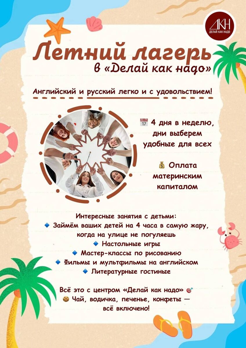 ! Ищете, чем занять ребёнка в жаркие дни? Мы приглашаем детей в наш летний лагерь — интересно, полезно и вкусно 🔥 📅 Режим: 4 дня в неделю, расписание составим с учётом удобства всех участников 💰 Оплата материнским капиталом — выгодно и доступно ✨ Что ждёт детей? 🔹 Настольные игры — логика и командный дух 🔹 Мастер-классы по рисованию — творчество без границ 🔹 Фильмы и мультфильмы на английском — язык в радость 🔹 Литературные гостиные — книги, речь, воображение ☕️ Всё включено: чай, вода, печенье, конфеты Займём ваших детей на 4 часа в самую жару, когда на улице не погуляешь. Наполним лето яркими эмоциями и новыми знаниями 🤗 Присоединяйтесь — подарите ребёнку незабываемое лето с «Делай как надо»! 🌟 Запись и вопросы: 📞 +7(979)036-52-42 (администратор) 📞 +7(979)074-69-04 (директор) 📎 https://yandex.ru/profile/35695634342 — отзывы #ДелайКакНадо #ЛетнийЛагерь #АнглийскийДляДетей #МастерКлассы #Лето2026 #РепетиторскийЦентр