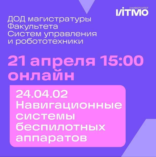 📡 Первый в очереди День открытых дверей магистратуры 24.04.02 «Навигационные системы беспилотных аппаратов» ✨ Доцент и магистр направления расскажут: — чем уникальна программа — какие навыки вы получите — почему стоит поступать именно сюда 📅 21 апреля 2026 ⏰ 15:00 💻 онлайн (подключение по ссылке) Если вам интересны беспилотники, навигация и технологии будущего — тогда подключайтесь, будет интересно 🔥 #РобототехникаИТМО #ФСУиР