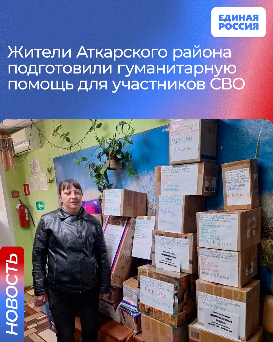 Участницы партийного проекта «Женское движение Единой России», волонтеры группы «Неравнодушные сердца» и работники сельского Дома культуры села Даниловка Аткарского района под руководством члена партии, активистки партийного проекта «Женское движение Единой России» Ольги Симогостицкой подготовили гуманитарную помощь для передачи бойцам специальной военной операции.