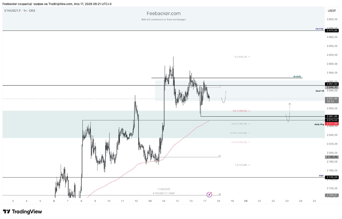ETH продолжает торговаться в premium-зоне value area (2145–1925$), удерживаясь выше VAH. Основной таргет текущего движения — 1M FVG, что сохраняет потенциал для продолжения восходящего импульса.