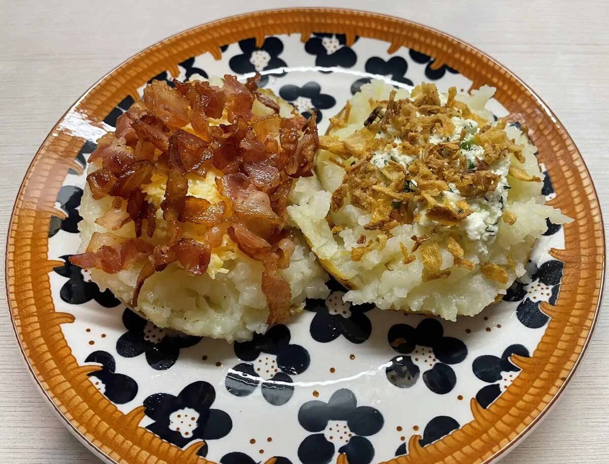Любите печёную картошечку? Да ещё и с разными наполнителями? 😍 Сегодня расскажу, мои любимые поварята, как приготовить простую картошку так, чтобы она стала ещё ароматнее и вкуснее! Если у вас нет сил готовить ужин — этот рецепт подойдёт идеально. Как всегда на кухне у Марисабелечки: быстро, просто и ооочень вкусно! 👩🍳✨ Основа: Для хруста: Возьмём крупный картофель, хорошенько вымоем его, обсушим и отправим в духовку при температуре 180 градусов примерно на 50 минут. Готовность проверяем тонким ножом — входит легко? Значит, готова. А пока она запекается, у вас есть целых 50 минут, чтобы ничего не делать, или приготовить начинки😊 Уверена, что вы выберете второй вариант💗 Готовим наполнители👩🍳 У меня сегодня 2 вида начинки: Первый вариант: сыр + чеснок + майонез. Можно добавить мелко нарезанную ветчину — будет ещё вкуснее😋. Второй вариант: сыр фета + чеснок + укроп + майонез. Майонез нам нужен для нежной и однородной консистенции — чтобы удобно было смешивать. И для сочности, ко