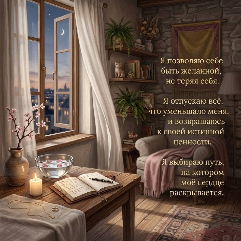 чувство готовности к следующему этапу. Здесь тонкие ткани ловят воздух, на столе горит свеча, есть красивые вещи и каждая деталь напоминает: новое входит туда, где есть красота, достоинство и любовь к себе. Это дом, где не принижают свои желания, не обесценивают движения души и не сжигают мосты, начиная новое. Это дом, где женская сила проявляется как ясность, притяжение, верность себе и право жить в красоте. Здесь старое отпускают с любовью, а новое призывают, давая ему место. Как будто сама душа надевает светлое платье, расправляет плечи, открывает окно и говорит жизни: теперь я выбираю только своё.