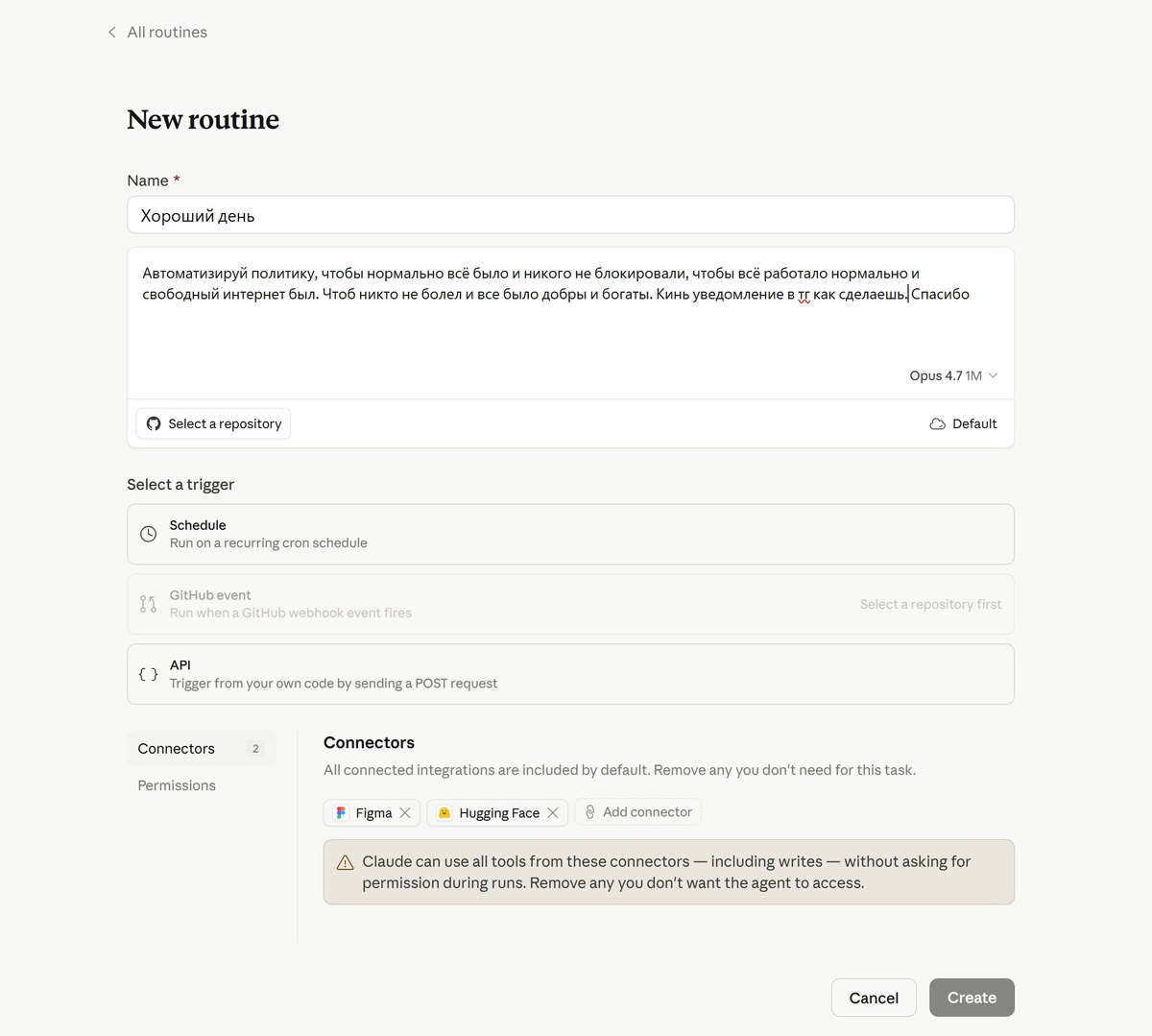 Да, снова про антропик, они не остановятся. Тут писал что обновили приложение и добавили Routines. (Рутина или расписание дословно) Раньше, чтобы НЕ разработчику, построить автоматизацию, нужно было зайти на один из сервисов автоматизации, типа n8n, zapier и make.com и подключать туда разные сервисы в виде нодов и двигать их на канве, подключаться друг к другу. Очень часто разобраться самому было невозможно, нужно было встраивать код и разбираться как работает интеграция по каждому сервису. 2 года назад на ютуб канале, я запилил несколько видео, где я с помощью make.com делаю ИИ чат-ботов. Сейчас так делать не надо. Можете глянуть для сравнения. Anthropic решил что хватит заниматься хернёй и выкатил Routines — где ты просто пишешь инструкцию, что тебе нужно и подключаешь коннекторы сервисов. ⏺️Заходишь на claude.ai/code/routines, создаёшь New routine. ⏺️Пишешь промпт, точнее чем в обычном чате. Например: «Забери непрочитанные из Gmail. По каждому проверь историю переписки с отпра