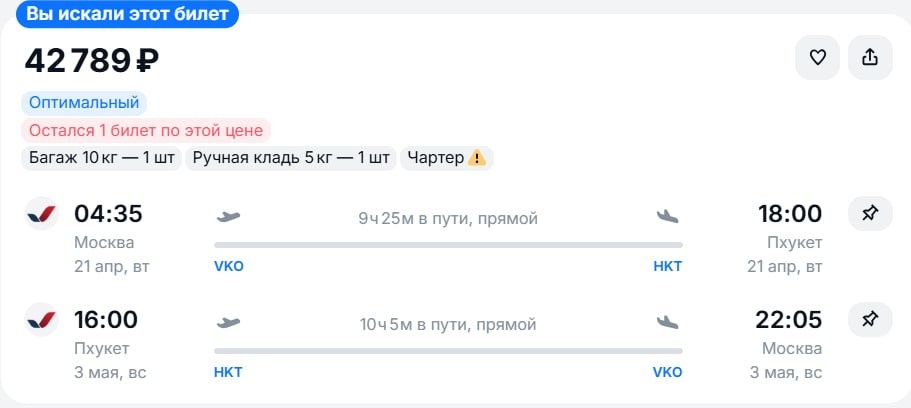! 🛫Берем билеты из Москвы на Пхукет за 42800 рублей в обе стороны (билетов минимум 2 в наличии) 21 апреля - 3 мая https://aviasales.tpo.li/T2cX6LAg 🏨 Бронируем отель от 4200 рублей на человека за 12 дней проживания (при поездке вдвоем) https://trip.tpo.li/scA2IXT4