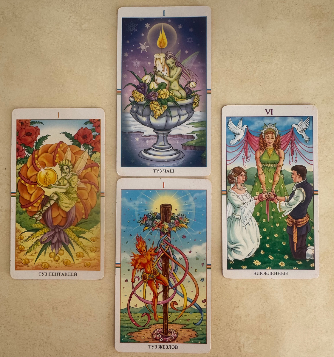 Я переворачиваю карты одна за другой, и у меня перехватывает дыхание. Смотри, моя родная. Три Туза. ТРИ! Туз Чаш, Туз Жезлов, Туз Пентаклей — они вышли вместе, как три богатыря, чтобы защитить тебя от всех невзгод и одарить несметными сокровищами. И сверху — старший аркан Влюблённые. Это не просто удача. Это кармический фейерверк. Это космическая зелень светофора для всех твоих желаний.