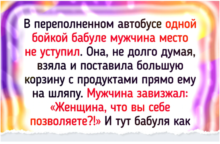 - В переполненном автобусе одной бойкой бабуле мужчина место не уступил. Она, не долго думая, взяла и поставила большую корзину с продуктами прямо ему на шляпу. Мужчина завизжал: «Женщина, что вы себе позволяете?!» И тут бабуля как выдаст: "А тебе какое дело?" Все пассажиры попадали от смеха! © Татьяна Кожевникова