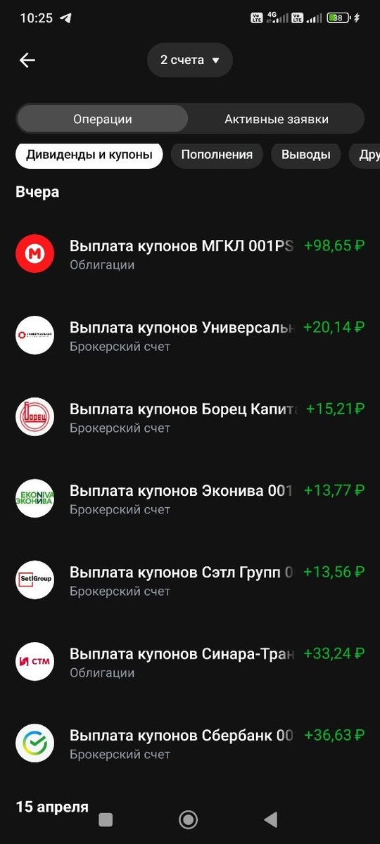 Сегодня пятница конец рабочей недели. И подведение недельных итогов. ✔️ На скринах купонные выплаты Которые приходили с 13 по 16 апреля. 💸 На накопившиеся средства купил 2 облигации: МГКЛ 001PS-01 Рейтинг: ВВ- $MGKL1P1 Купон: 24% ежемесячный Воксис 001Р-02 Рейтинг: ВВВ+ $RU000A10E9Z7 Купон: 20% ежемесячный ⚠️ Эти облигации относятся к ВДО (высокодоходные) но рискованные облигации. Рейтинг невысокий. Поэтому на большую долю заходить конечно не нужно. Оцениваете свой риск-менеджмент. ‼️Не является инвестиционной рекомендацией! Всем удачных инвестиций и зелёных портфелей ! 🤩 Подписывайтесь Инвест Доход в: 📢 МАХ 📱 БАЗАР ✈️ Телеграм 🏦 Пульс