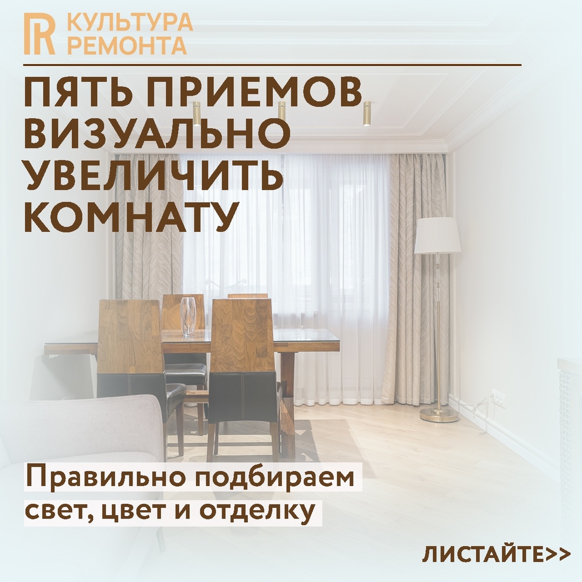 Даже небольшая типовая квартира в Нижнем Новгороде может выглядеть просторнее, если правильно поработать со светом, цветом и отделкой. Рассказываем, какие приемы мы используем в своих проектах. Листайте карточки. Свет – один из самых сильных инструментов, когда нужно визуально увеличить комнату. Чем больше естественного света, тем просторнее выглядит интерьер, поэтому тяжелые плотные шторы лучше заменить на легкие, полупрозрачные, которые пропускают максимум дневного света. Зеркала напротив окна и многоуровневое освещение (люстра, бра, торшеры, подсветка полок) помогают добавить глубины и убрать темные «провалы» в комнате. В индивидуальном дизайн‑проекте мы заранее закладываем разные сценарии освещения под ваш образ жизни. Это значит, что в доме не будет лишних светильников «на всякий случай», но при этом света окажется достаточно для работы, отдыха, чтения и вечеров с семьей. Светлые оттенки – классический способ визуально расширить пространство. Белый, светло‑серый, бежевый и мягки