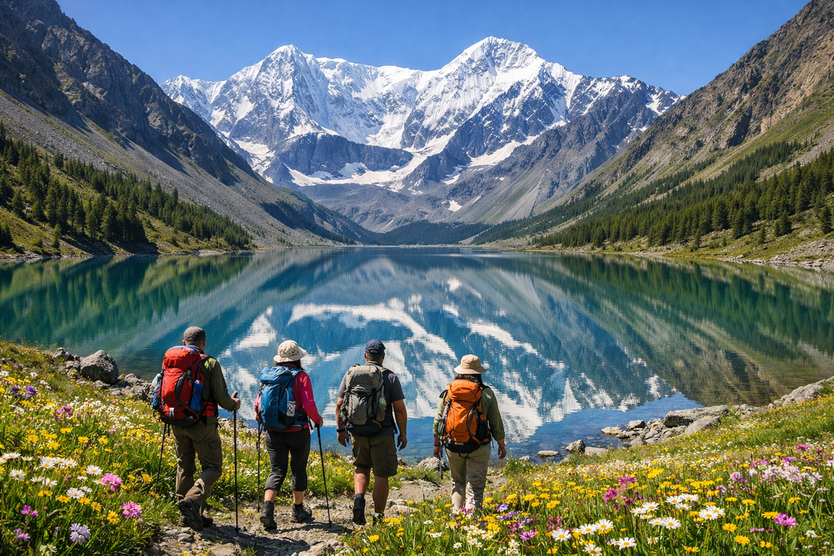 Для тех, кто хочет видеть Белуху, но не планирует ходить по высоким склонам, есть прекрасная альтернатива: комбинированные маршруты от Тюнгура, длительностью 12–16 дней. Вы проходите долину семи озёр, делаете прогулки в альпийские луга, отдыхаете на бане, походите к водопадам, и всё это сопровождается видами на Белуху. Это вариант, где вы смотрите на гору с разных сторон, не перегружая себя восхождениями, но получая насыщенный опыт.