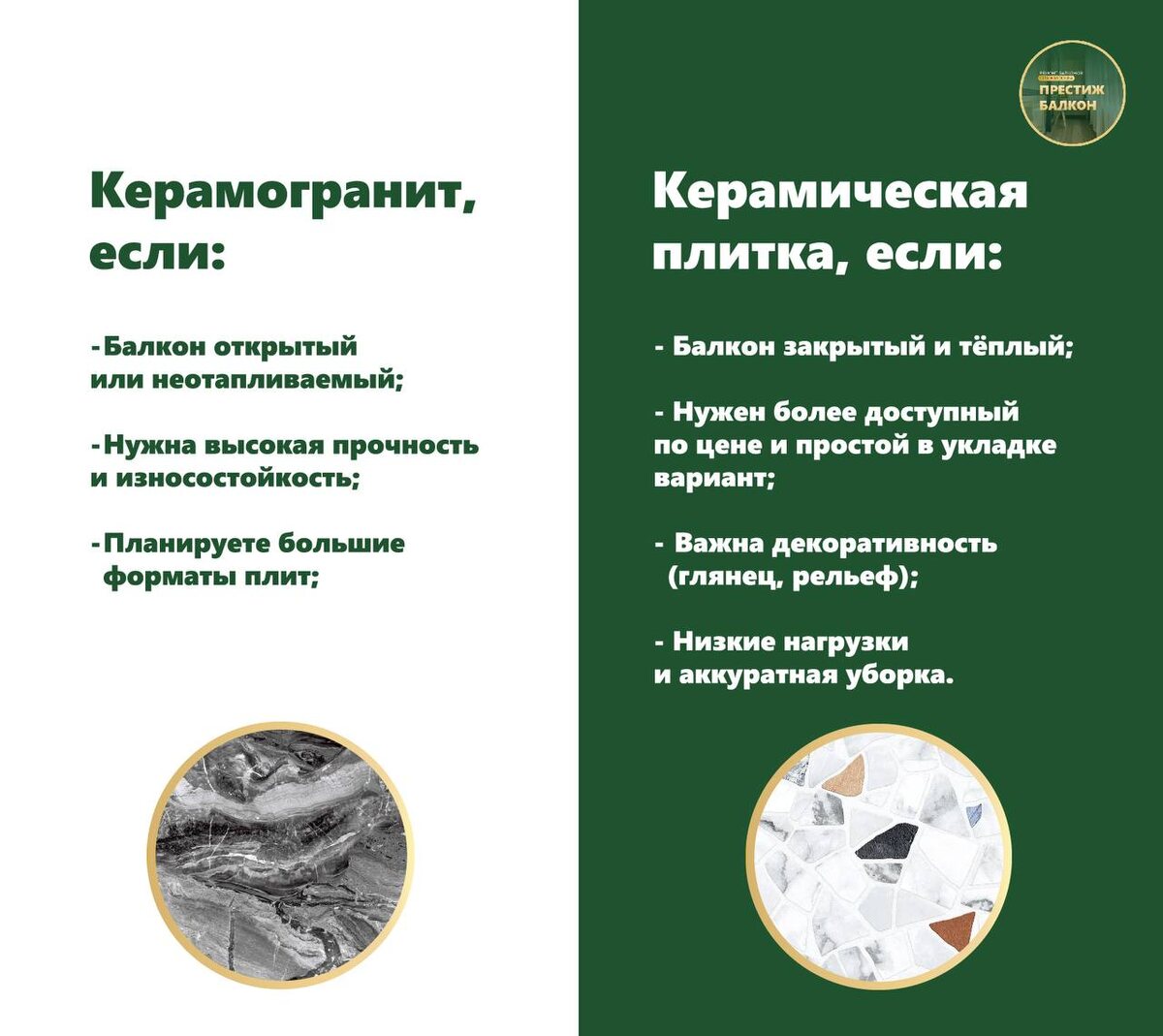 ☝🏻 💬 Керамическая плитка делается из обожжённой глины с тонким декоративным слоем. Она легче в обработке, дешевле и даёт много вариантов по фактурам и цветам. Для тёплого, закрытого балкона с минимальной влажностью и нагрузками это хороший и экономичный вариант. 💬 Керамогранит обладает большой прочностью и износостойкостью. Это делает его предпочтительным для открытых или неотапливаемых балконов. Керамогранит лучше переносит интенсивную уборку и агрессивные моющие средства. 👉🏻 Наша компания поможет подобрать и установить оптимальное покрытие, напишите или позвоните — посоветуем вариант под ваш балкон и бюджет! Подпишись ВК | MAX СПб: +78127010779 МСК: +74951320779 💬 Чат с менеджером: @prestig_balkon