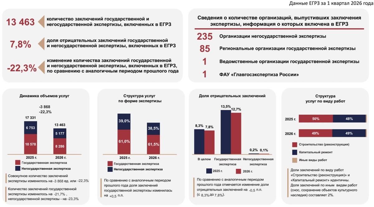 🇷🇺 На сайте ГИС ЕГРЗ опубликованы: ▪️ Основные показатели деятельности организаций экспертизы за 3 месяца 2026 года по данным ЕГРЗ ▪️ Аналитический бюллетень ЕГРЗ за 3 месяца 2026 года ℹ️ По итогам 3-х месяцев 2026 года: ✔️ 13 463 заключений включено в ЕГРЗ, что на -22,3% меньше аналогичного периода 2025г., при этом доля в рамках гос/негос – 8 286 (-22%) / 5 177 (-23%) 📊 322 экспертных организаций (гос/негос – 87/235) (на -13% меньше аналогичного периода 2025г.), при этом доля от всех выданных заключений гос/негос – 61,5% / 38,5% ❌1056 отрицательных заключений (7,8% от всех) (на -0,5% меньше аналогичного периода 2025г.), при этом доля в рамках гос/негос – 12,7% / 0,1% ⚠️ Каждое пятое заключение госэкспертизы в России по объектам строительства/реконструкции отрицательное! 📀 Скачать аналитику: Показатели | Бюллетень ➡️Итоги всех Экспертиз за: 2023г. | 2024г. | 2025г. ➡️Типовые замечания Экспертиз ➡️Эксперты России #Экспертиза #ЕГРЗ #Аналитика Экспертиза смет: в MAX 📲 | в Дзе