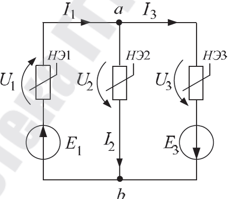 Дугинов Л.А. l.duginov@mail.ru Ключевые слова: схема постоянного тока, нелинейные сопротивления, новый метод решения, итерационная формула, табличный ввод данных. ВВЕДЕНИЕ Предложенная для расчёта электрическая схема, показана на рис.1, Рис.1 Электрическая схема постоянного тока с 3-мя нелинейными сопротивлениями Z1-Z3. Первый способ решения схемы рис.1 был опубликован в интернете Шабловским Я.О. в учебном пособии для студентов ГГТУ им. П.О. Сухого г.Гомель. "Нелинейные электрические сети" см.( л.5): В качестве исходных данных Я.О. Шабловский предлагает ВАХ на рис.2 (вместо табличных данных) так как метод решения задачи исключительно графический. Рис.2 ВАХ трёх нелинейных сопротивлений НЭ1-НЭ3 (рис.1.) (номера кривых совпадают с номерами сопротивлений НЭ1-НЭ3) Для решения задачи автор предлагает оригинальный алгоритм: Да - интересный графический способ решения данной задачи, но к сожалению его можно применять только на небольших нелинейных электросхемах. Для схем с
