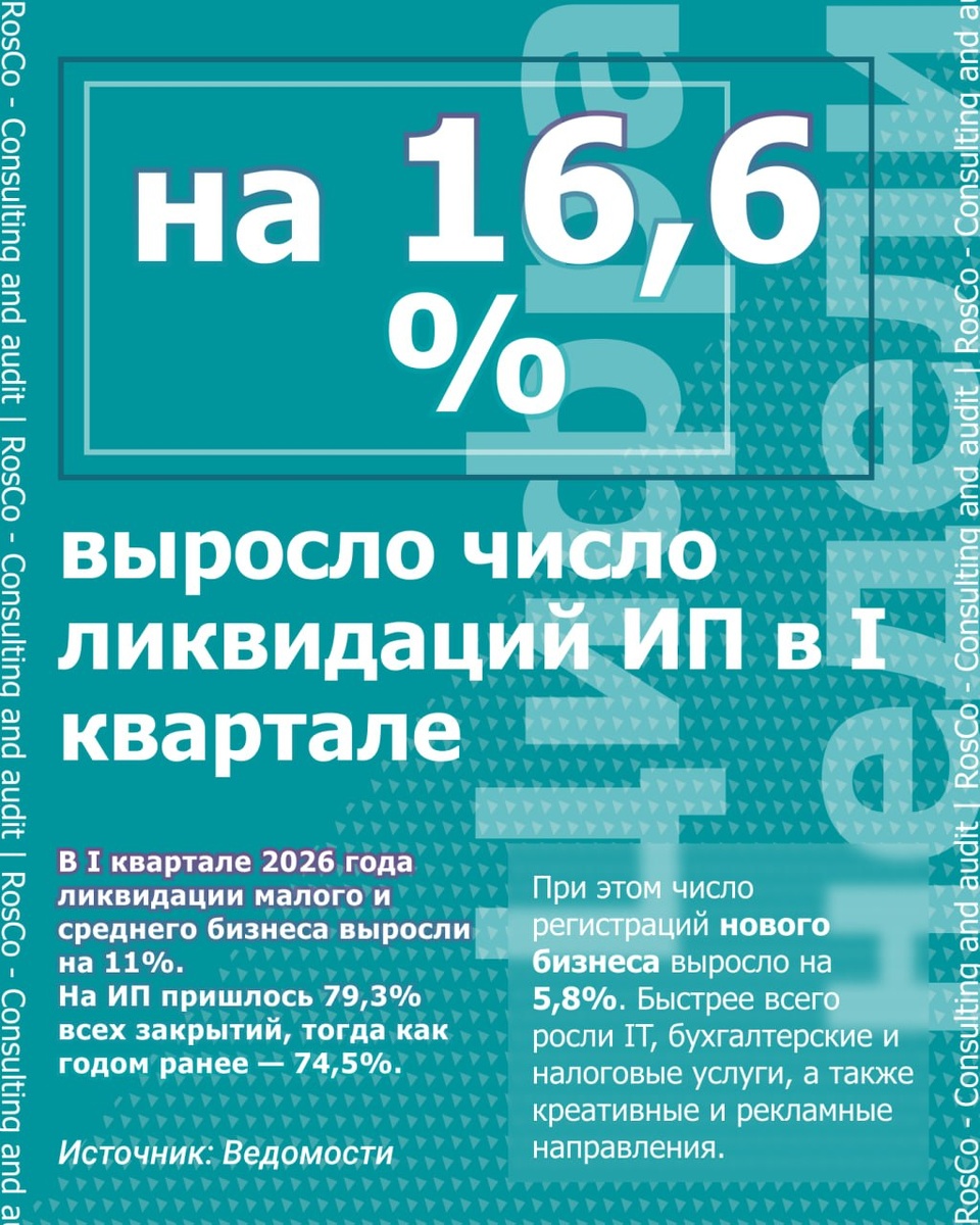 В I квартале 2026 года ликвидации малого и среднего бизнеса выросли на 11%. На ИП пришлось 79,3% всех закрытий, тогда как годом ранее — 74,5%. Ликвидации ИП за квартал увеличились на 16,6%, а юрлиц — снизились на 11,4%. Чаще всего закрывались ИП в строительстве и обрабатывающем производстве. При этом число регистраций нового бизнеса выросло на 5,8%. Быстрее всего росли IT, бухгалтерские и налоговые услуги, а также креативные и рекламные направления. О закрытии или продаже бизнеса задумываются 31% предпринимателей. 💼 «РосКо» в Telegram и Max