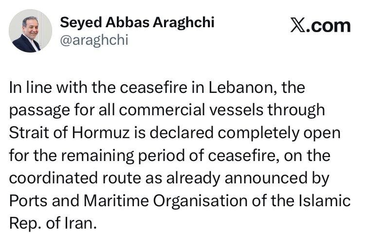 Глава МИД Ирана Аббас Аракчи в связи с перемирием в Ливане заявил, что проход всех коммерческих судов через Ормузский пролив полностью открыт на время прекращения огня. «В соответствии с достигнутым в Ливане прекращением огня проход всех коммерческих судов через Ормузский пролив объявляется полностью открытым на оставшийся срок перемирия по согласованному маршруту, как уже было объявлено организацией портов и морского судоходства Ирана», - написал Аракчи в соцсети X. Президент США Дональд Трамп назвал Ормузский пролив «проливом Ирана», поблагодарив Тегеран за его открытие для коммерческого судоходства. Читайте на сайте газеты «Совершенно Секретно»: ТРЕВОЖНЫЙ SIGNAL ДЛЯ ТРАМПА Тот самый чат в Signal. Почему американские власти обсуждает военные планы в мессенджерах, а Трамп стоит горой за подставляющих его чиновников?