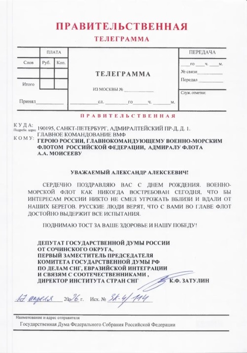 Сердечно поздравляю Вас с Днем Рождения. Военно-Морской флот как никогда востребован сегодня, что бы интересам России никто не смел угрожать вблизи и вдали от наших берегов. Русские люди верят, что с Вами во главе флот достойно выдержит все испытания.