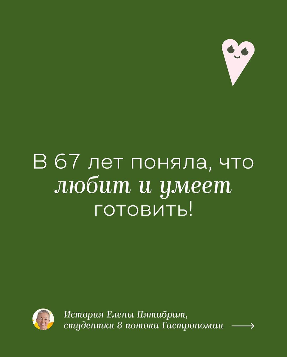 67 лет думала, что не любит готовить... а потом за 2 месяца перевернула весь свой быт! Восхищаюсь выпускницей Гастрономии Еленой Пятибрат и делюсь с вами ее историей в карточках. Все техники, алгоритмы и секреты приготовления, которые помогли Елене и еще 19 000+ выпускникам изменить кухонную рутину, отдам студентам нового потока «Гастрономии». Гастрономия — моё открытие 2025 года и, наверное, одна из лучших инвестиций в Качество Жизни! — написала выпускница в отзыве. Елена приобрела курс за 2 дня до старта потока и считает, что он стоит каждой затраченной копейки! А у вас есть возможность присоединиться уже 28 апреля на закрытой презентации — со скидкой 40%, 20 бонусами и ценными призами из колеса удачи. Предзапись открыта по ссылке ⚡