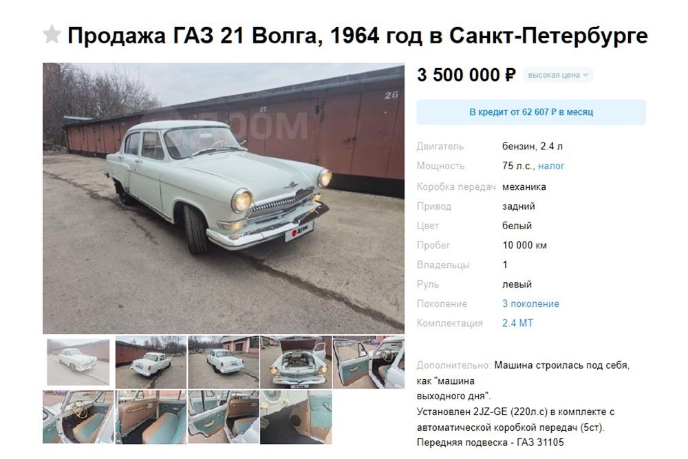 В Санкт-Петербурге на одной из онлайн-площадок выставили на продажу уникальную ГАЗ-21 «Волга» 1964 года. Машина оснащена мощным японским турбо-мотором 2JZ-GE на 220 л.с и автоматической коробкой передач. Владелец утверждает, что все внесенные изменения официально зарегистрированы, что существенно упрощает последующую постановку на учет. Передняя подвеска автомобиля была модернизирована и взята от ГАЗ-31105, а задний мост — от Volvo. Дисковые тормоза установлены как спереди, так и сзади. Кузов был полностью перекрашен, произведена шумоизоляция, а хромированные детали заменены на новые. Салон седана полностью восстановлен с использованием материалов, максимально приближенных к оригинальным заводским. Владелец подчеркивает, что стремился сохранить аутентичность, одновременно обеспечив комфорт для повседневного использования. Продавец просит за «Волгу» весьма значительную сумму — 3 500 000 рублей. С точки зрения коллекционеров, эта машина не представляет особой культурной ценности, так как