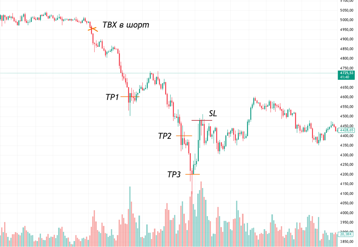 Я уверен, что ты уже навидался сделок от «гуру трейдинга», где они закрывают свои сделки по хаям (либо шорты по лоям), а дальше рынок разворачивается. Но где эта тонкая грань, чтобы не выйти рано и остаться с фомо, либо вообще закрыться в безубыток, потому что ты пропустил свою станцию на выход? ЛОГИКА ДЕЙСТВИЙ Думаю, что много расписывать на тему того, зачем дробить свои выходы, не имеет смысла. Это необходимо для того, чтобы не переживать за мгновенный разворот рынка, а также для минимизации убытка, если разворот всё же произошёл. Главный минус такого подхода тоже очевиден. О нём я напомню в конце и заодно расскажу, как с этим быть. Не нужно делать слишком много дроблений – двух-трёх будет вполне достаточно. На всякий случай оговорюсь: дробить нужно только тейк-профит! Стоп-приказ выставляется на всю текущую позицию! (Ты же не забываешь его ставить?) Выходить частями можно при торговле на любых таймфреймах любыми инструментами, но подход может немного отличаться. Пример дробного вых