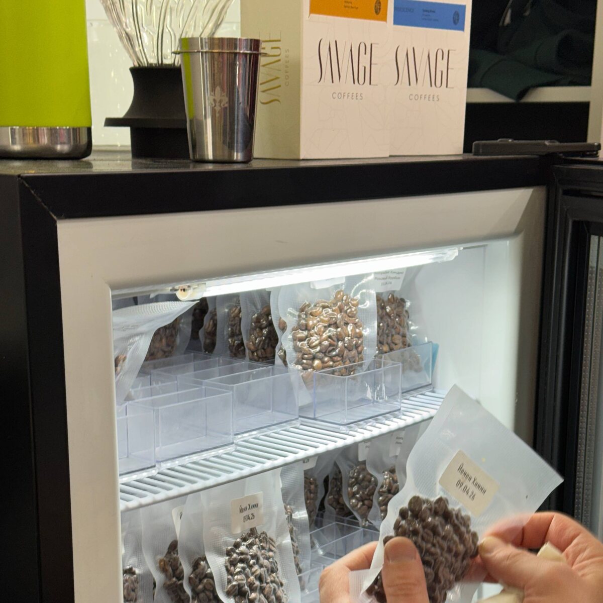 На стенде Сибаристики выпил фильтр-шот на замороженном зерне Йемен Химми. Расфасованные порции хранят в морозилке, а смалывают на кофемолке FM Grinder.