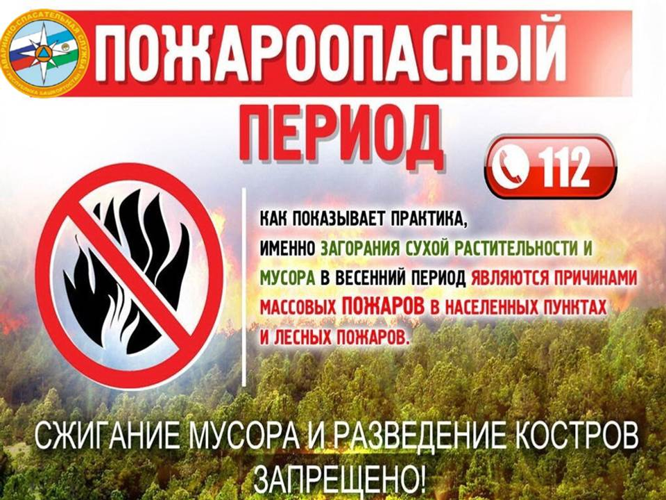 Весна и лето — пожароопасный сезон. Каждый год повторяется ситуация горения сухой прошлогодней травы, оттаявшего бытового мусора, что в свою очередь может привести и приводит к возгоранию насаждений лесных полос, выгоранию травяной растительности на больших площадях. Чтобы не допустить возникновения пожара, необходимо знать и соблюдать элементарные правила пожарной безопасности в период пожароопасного сезона (в период устойчивой сухой, жаркой и ветреной погоды):