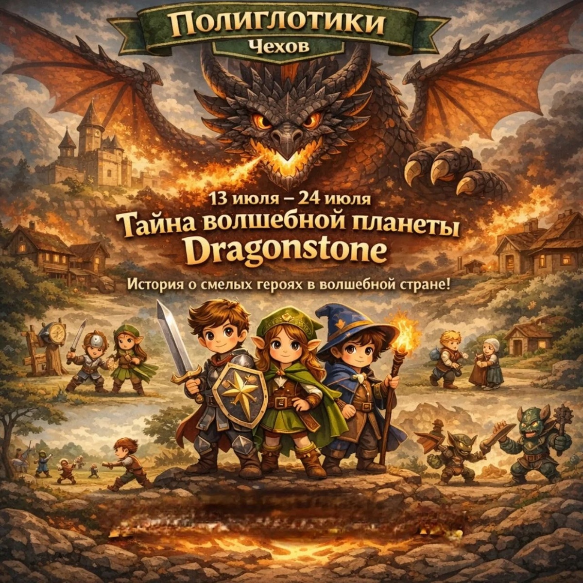 🌟 Полиглотики приглашают в летнее приключение! 📅 13 июля – 24 июля 🚀 «Тайна волшебной планеты Dragonstone» Это не просто программа — это захватывающая история, где дети становятся героями! Им предстоит попасть в волшебную страну, где злой дракон держит жителей в страхе… и только смелость, дружба и развитие помогут всё изменить. ✨ В программе: — перевоплощение в уникальных персонажей — помощь жителям и выполнение миссий — активные тренировки и задания на свежем воздухе — сражения с монстрами — финальная битва с драконом! Каждый ребёнок станет частью большой истории и прокачает навыки, уверенность и воображение 💫 🔥 Количество мест ограничено! Записывайтесь уже сейчас, чтобы ваш ребёнок стал героем этой легенды. 📩 Оставьте любой комментарий и мы расскажем все подробности🙌