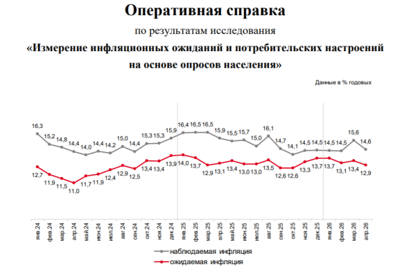 Опубликованы свежие данные по инфляционным ожиданиям и наблюдаемой инфляции. Это одни из ключевых показателей, на которые обращает внимание Центробанк, принимая решения по ставке. В сравнении с мартовскими данными, показатели несколько снизились, но в целом остаются примерно на одном высоком неизменном уровне уже полгода. Снижение ставки без снижения данных показателей будет означать рост инфляции, что наблюдалось уже и после предыдущего заседания регулятора, и продолжится далее. Однако ЦБ практически наверняка продолжит цикл снижения ставки, поскольку такое решение уже было согласовано с властями и ставит целью не допустить / сгладить происходящую в стране рецессию. Итак, в марте показатели инфляционных ожиданий и особенно наблюдаемой инфляции сильно выросли, а в апреле - обратно снизились примерно до февральского уровня. Ожидания составили 12,9% годовых, а наблюдаемая инфляция (реальная потребительская) - 14,6%. Если посмотреть на долгосрочный график этих показателей, то увидим там,