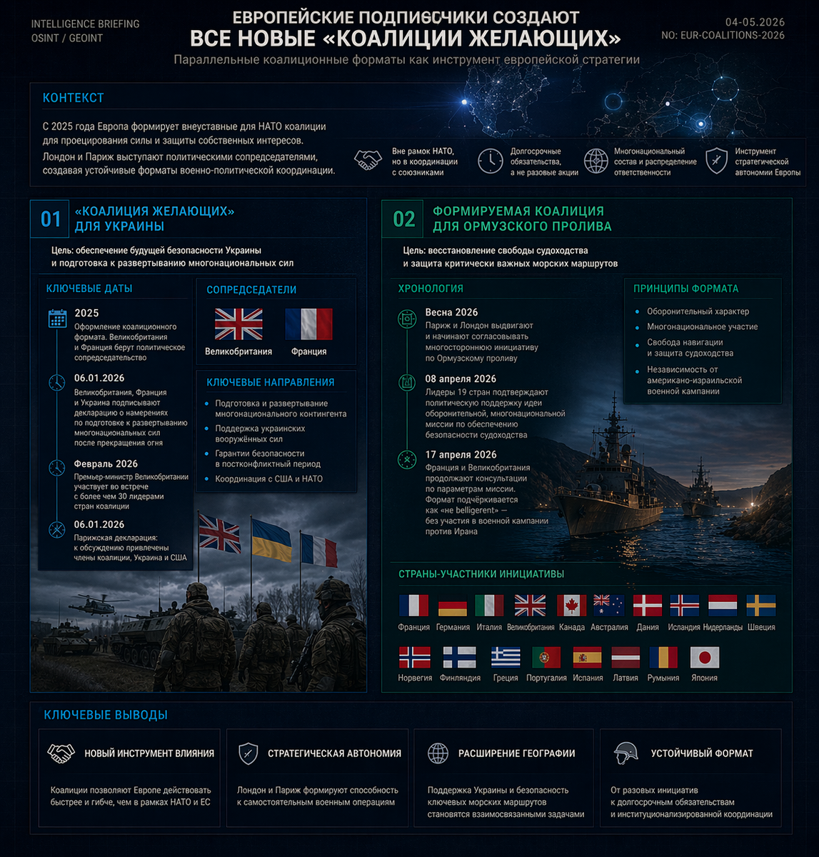 Весной 2026 года по той же логике начал оформляться второй коалиционный формат — уже вокруг Ормузского пролива. Здесь важно отметить, что верифицируемые источники не подтверждают в полном объёме все ранее циркулировавшие сведения о «первом заседании 2 апреля» под руководством главы британского внешнеполитического ведомства. Однако подтверждено иное: к 8–17 апреля Париж и Лондон выдвинули и начали согласовывать многостороннюю инициативу по восстановлению свободы судоходства в Ормузском проливе, причём речь идёт именно о «оборонительном», «многонациональном» и, принципиально, «не belligerent» формате, то есть без прямого присоединения к американо-израильской военной кампании против Ирана. 8 апреля лидеры Франции, Германии, Италии, Великобритании, Канады, Австралии, Дании, Исландии, Нидерландов, Швеции, Норвегии, Финляндии, Греции, Португалии, Испании, Латвии, Румынии, Японии, а также председатели Еврокомиссии и Евросовета подписали совместное заявление, где приветствовали двухнедельное перемирие между США и Ираном и прямо записали, что их правительства «будут содействовать обеспечению свободы навигации в Ормузском проливе».