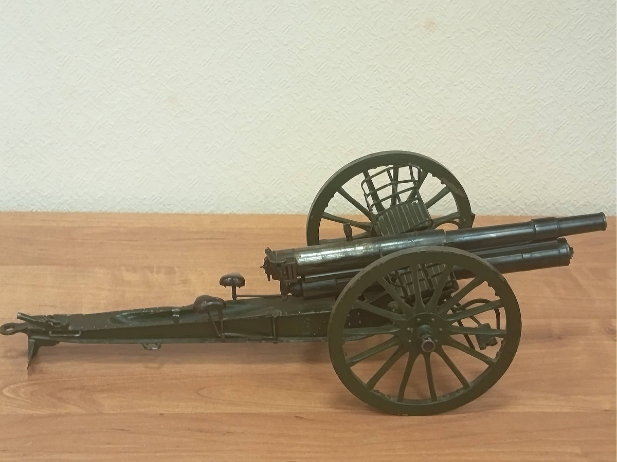 Его высота — 12, 5 см, ширина — 18 см, длина — 42 см. Модель пушки изготовлена из металла, дерева и кожи. Её элементы имеют конструкционную подвижность, покрыты красками черного и темно-зеленого цветов. На стволе пушки гравировка: «Общ. Путиловск. зав. №1.1904. С.- Петербургъ» и изображение в виде двуглавого орла. Предмет стал частью коллекции музея благодаря семье генерал-майора П. Г. Любимцева в 1985 году.