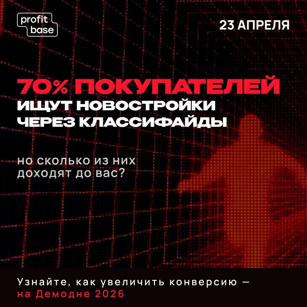 Он состоится 23 апреля и участие совершенно бесплатно. Надо сказать что ребята собирают качественный контент обычно, у них много кейсов и в целом я доверяю их продуктам и спикерам, поэтому официальный анонс: Классифайды — это первое свидание с покупателем Именно там 70% клиентов делают первый шаг к собственной недвижимости. Но конкуренция на площадках огромная. Поэтому, чтобы получать максимум из этого канала, важно тщательно работать над оформлением объявлений, чтобы они выделялись на фоне других предложений. 23 апреля на Демодне Profitbase 2026 коллеги расскажут: 📍 как застройщику не потеряться среди миллионов объявлений; 📍 какие инструменты позволяют заякорить внимание клиента и вызвать интерес к лоту; 📍 какие обновления в работе с классифайдами реально увеличивают конверсию в обращение. Конкуренция растет, но именно сейчас грамотная работа с классифайдами, новыми площадками и качеством карточек даёт шанс вытащить дополнительный спрос там, где другие его просто не замечают. П