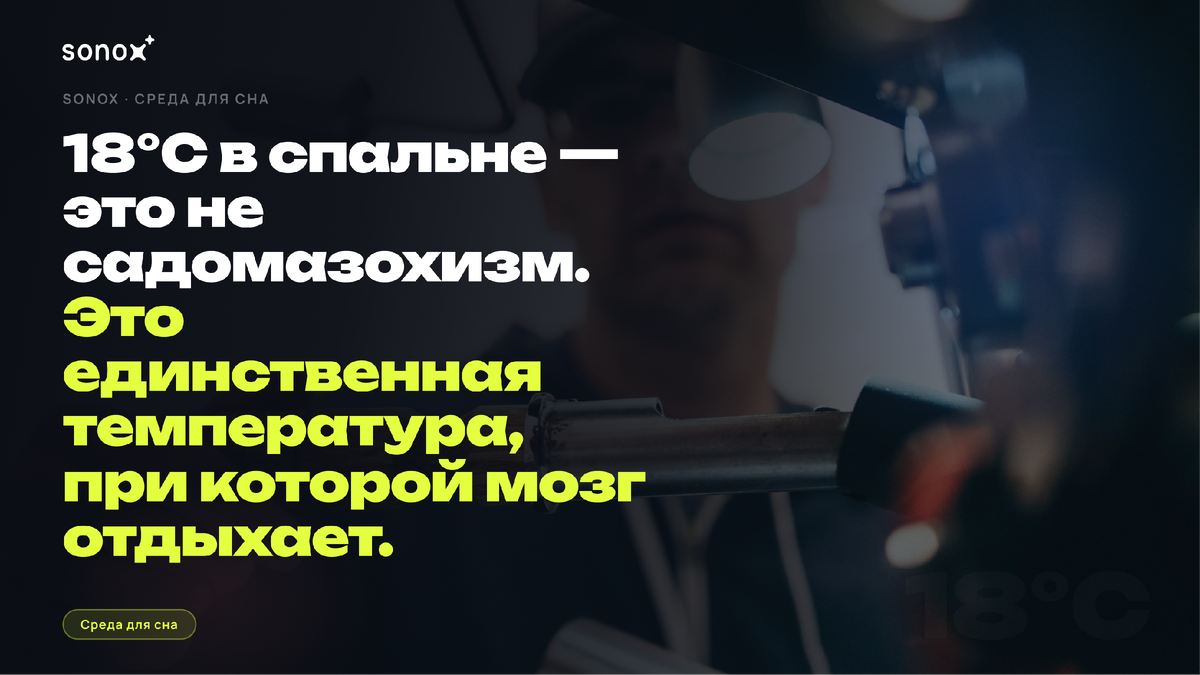 _____________________________________________________________________________________ Нет времени читать всё? Мы изучили десятки исследований о сне — и собрали главное в одном бесплатном материале. Узнаете причину именно вашего плохого сна и что изменить уже сегодня ночью. 👉 Забрать бесплатно → sonox-premium.ru/thank-you-gifts _____________________________________________________________________________________ Почему мозгу нужен холод Чтобы запустить глубокий сон, мозг должен снизить температуру тела примерно на 1–1,5°C относительно дневного уровня. Это не метафора — это буквально физиологический триггер. Пока охлаждение не произошло, мозг не переходит в медленноволновой сон (SWS, deep sleep). Именно поэтому люди обычно лучше спят в прохладной к