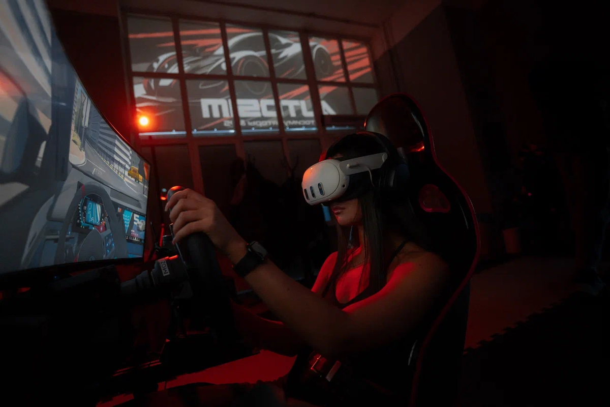 Разбираемся, что лучше для новичка, что для опытного пилота, и где какой формат раскрывается на 100%. VR (виртуальная реальность) — это очки, которые полностью закрывают обзор. Вы внутри машины. Поворачиваете голову — видите боковое окно, заднее стекло, соседнюю машину. Ощущения: вы не смотрите на гонку — вы в ней. Мозг действительно верит, что вы за рулём. Эффект присутствия максимальный. Это огромный изогнутый экран с соотношением сторон 32:9. По ширине он заменяет два обычных монитора, стоящих рядом. Ощущения: вы видите дорогу, боковые зеркала, соседние машины. Обзор панорамный, но вы всё ещё смотрите на экран, а не «внутри». Зато картинка чёткая, яркая и не утомляет глаза. 🎯 Кому подойдут VR-очки Однозначно да, если: Пример: вы проходите поворот на высокой скорости и инстинктивно поворачиваете голову в апекс. В VR это работает. На мониторе — нет. Совет: первый раз берите VR на 30 минут. Если затошнило — ничего страшного, пересаживайтесь на монитор. Со временем вестибулярный аппар